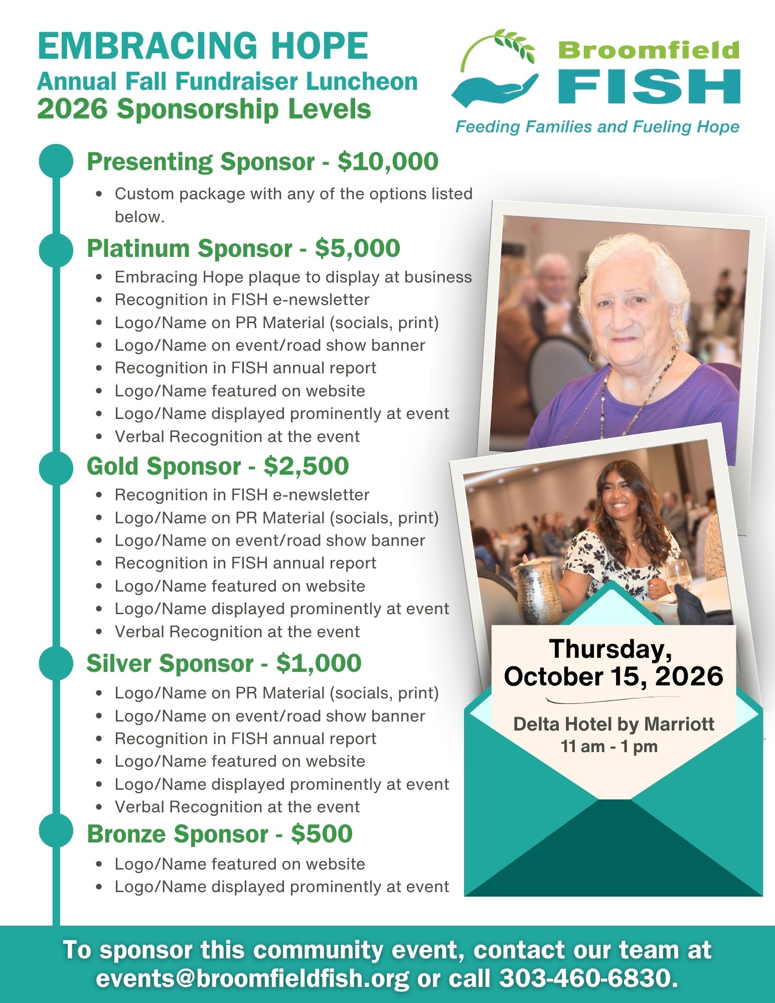 If you are interested in sponsoring Embracing Hope 2026 please visit our sponsorship portal or email Events@BroomfieldFISH.org .