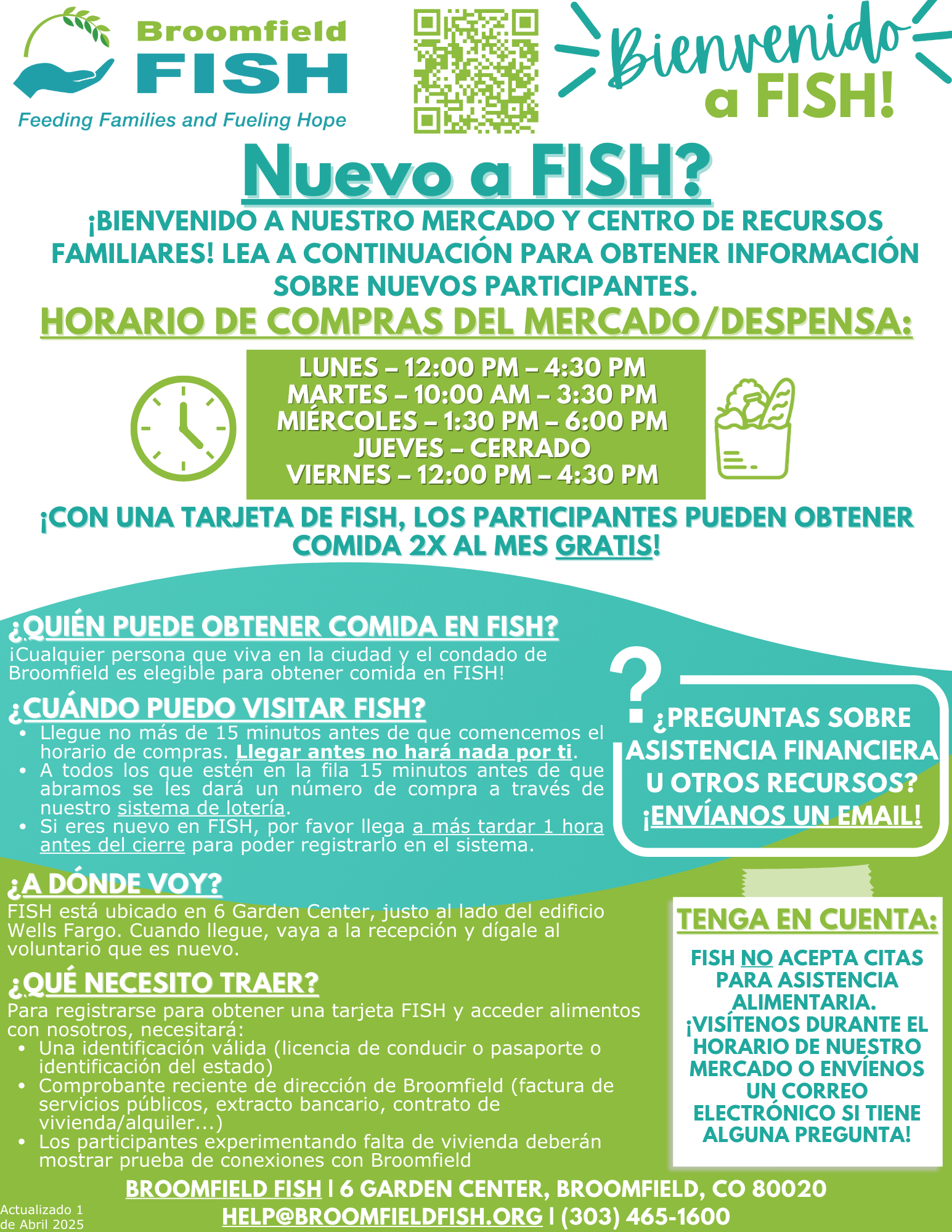FISH no acepta citas para asistencia alimentaria. ¡Visítenos durante el horario de nuestro mercado o envíenos un correo electrónico si tiene alguna pregunta!